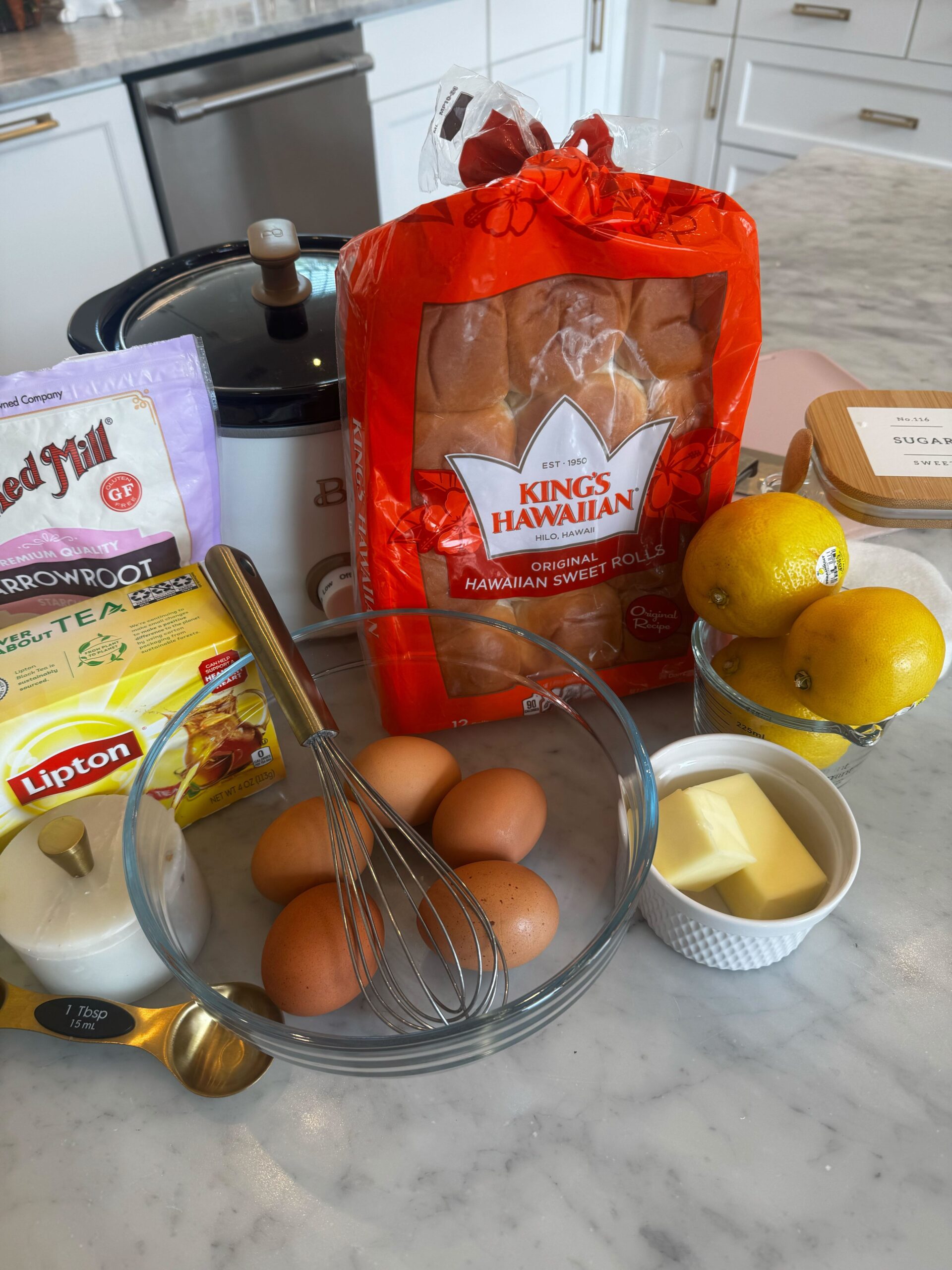 You’ll need a 12-pack of King’s Hawaiian rolls, fresh lemon juice, melted butter, sugar, eggs, cornstarch, and a pinch of salt. For the glaze, grab some buttercream frosting, black tea bags (Lipton works great), and a lemon for zest and juice.
