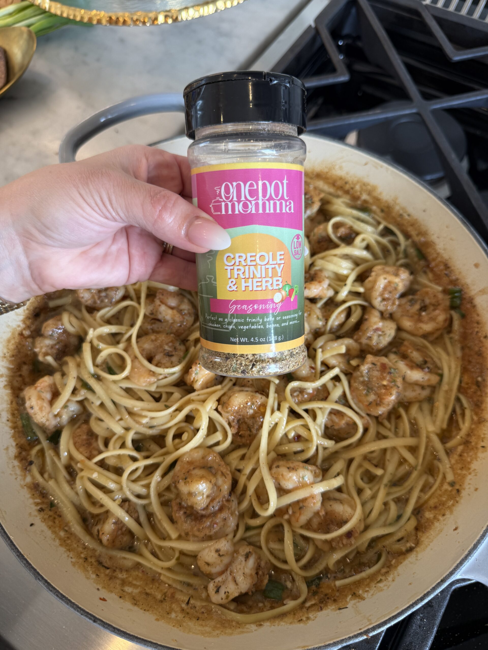 The Magic Seafood seasoning and Creole Trinity and Herb are used twice in this recipe, once on the shrimp before searing and again in the sauce itself, which is the layering technique that makes the flavor feel deep and cohesive rather than one-dimensional. The shrimp drippings left in the pot after searing carry the seasoning and fond that become the base of the sauce, so every element of the dish is connected from the first step to the last.