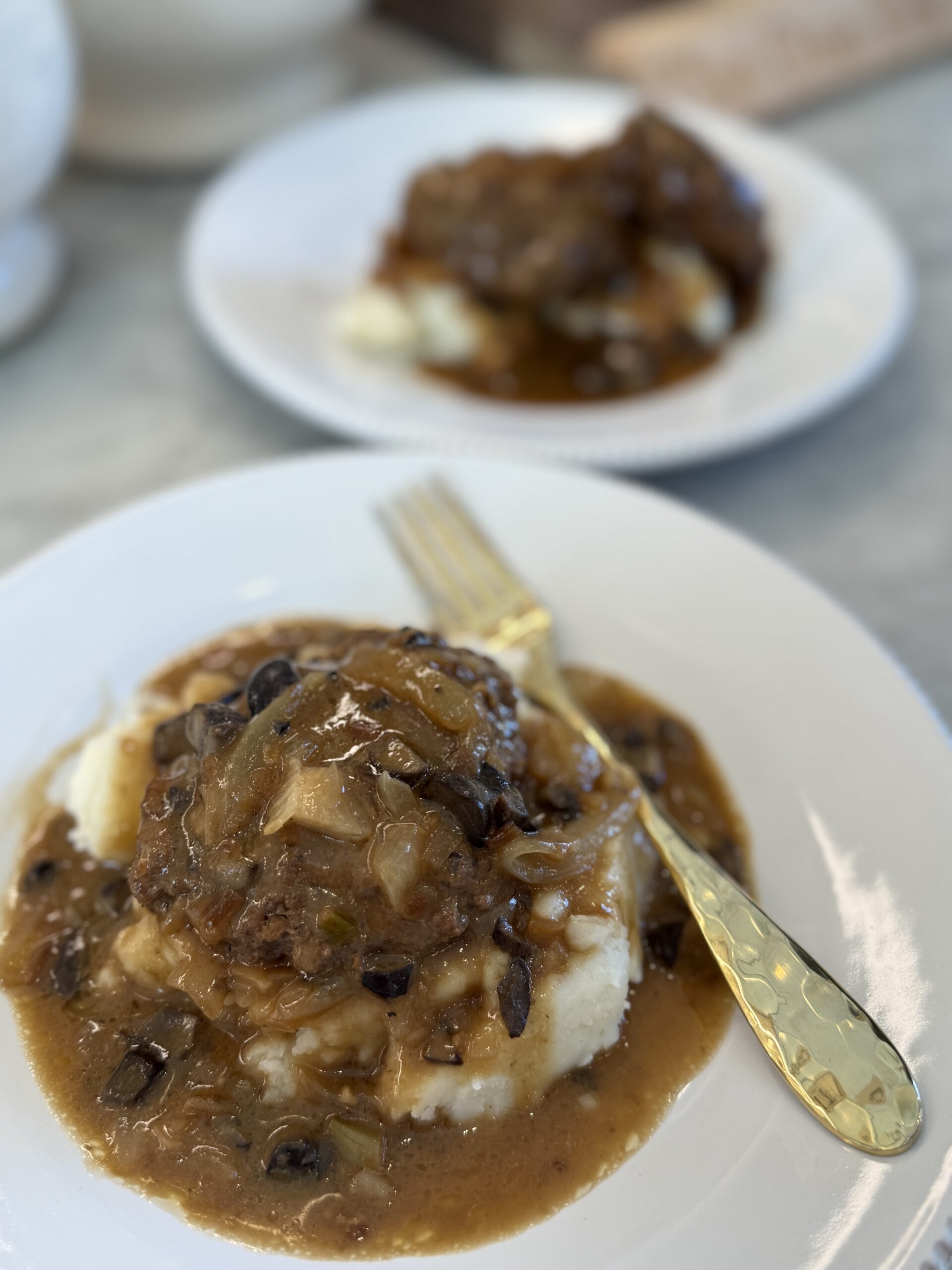 - Serve the patties hot with plenty of that creamy gravy. Spoon the sautéed mushrooms and onions over the top before serving. Perfect over mashed potatoes, rice, or egg noodles.