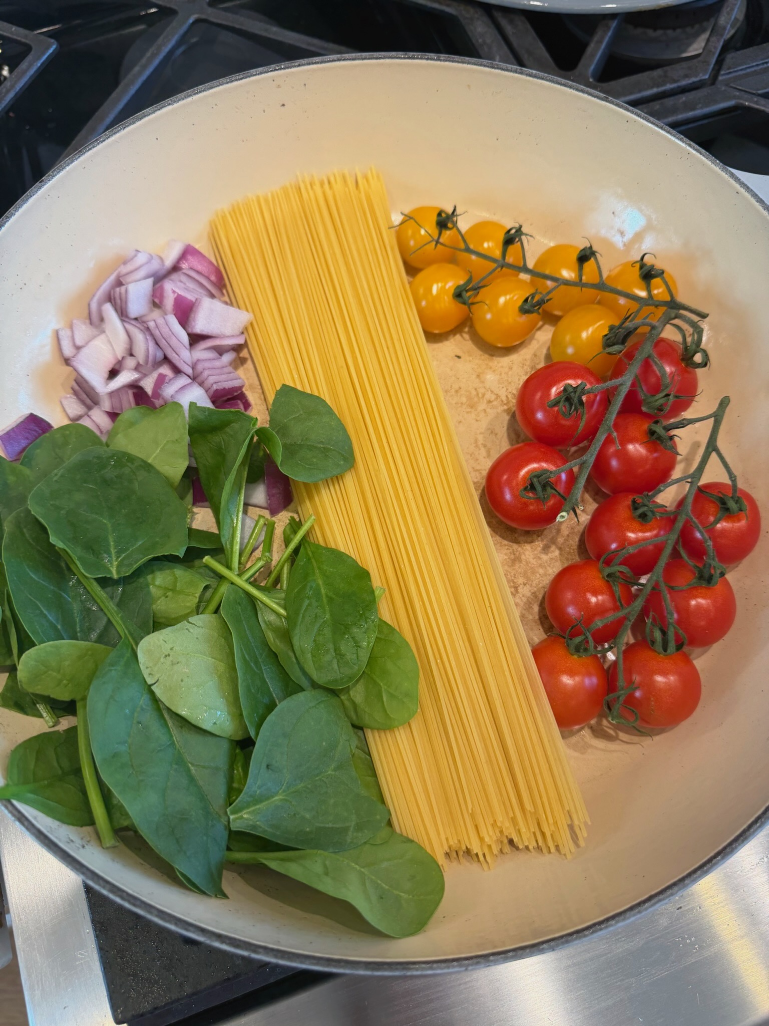 - Add: Dry pasta, Cherry tomatoes, Spinach, Red onion, Minced garlic, Marinara (or tomato paste), Chicken broth