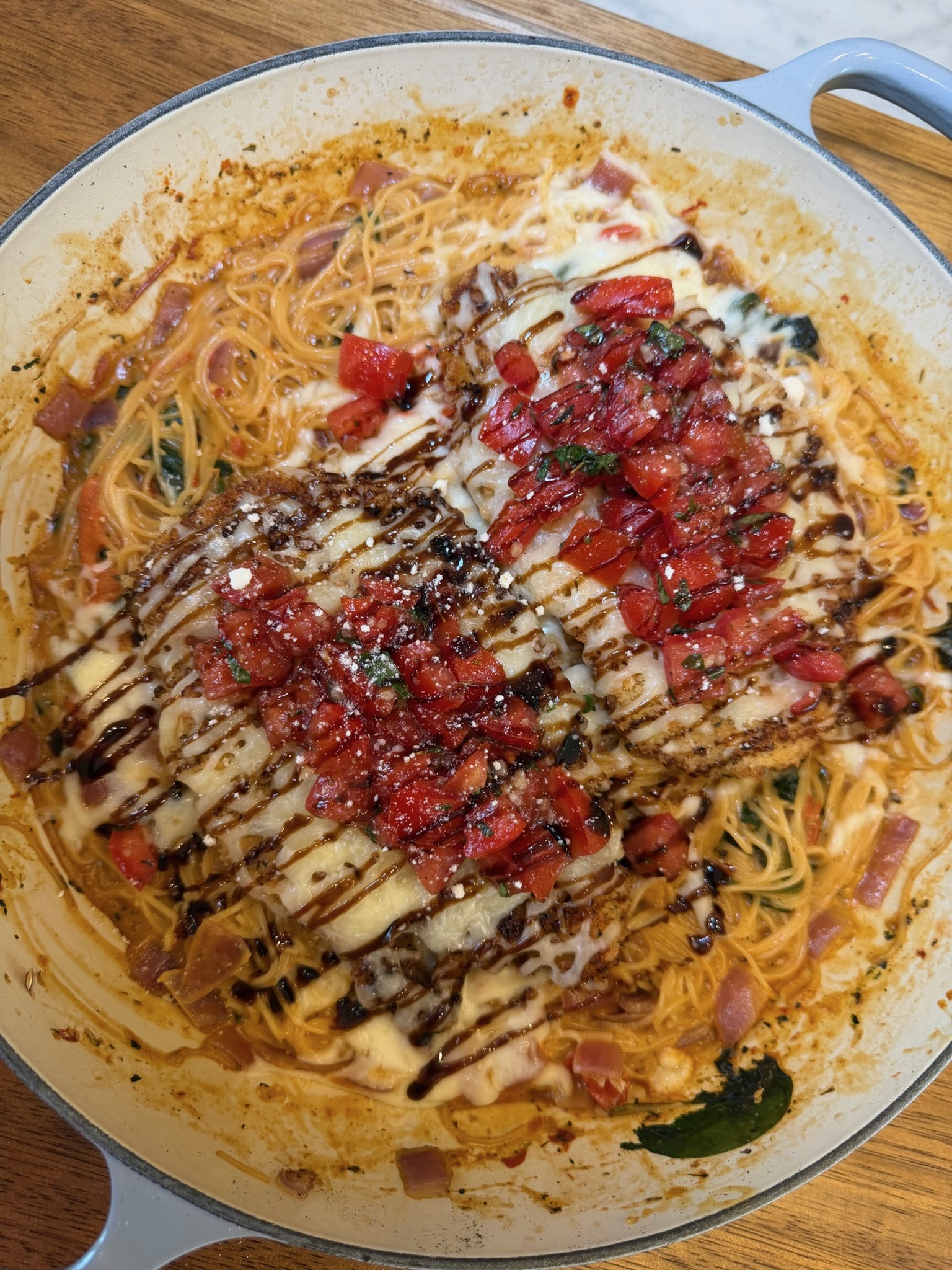 You get crispy, juicy pan-fried chicken. You get a creamy, tomato-kissed pasta made right in the same pot. And then you finish the whole thing with fresh bruschetta and a balsamic drizzle that makes it look like you ordered from your favorite Italian spot.